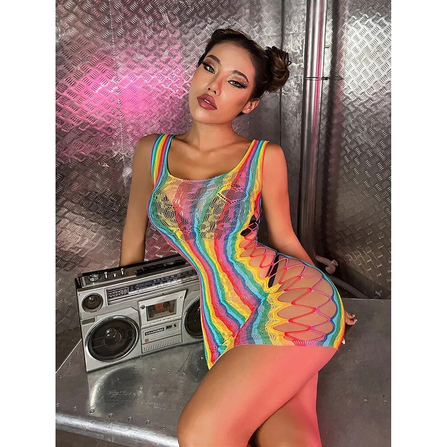E por último, mas não menos importante, temos o vestido cut out arco-íris. Se você quer um look divertido e vibrante, esse vestido é a escolha certa. Para um visual descontraído, experimente usar o vestido com uma sandália de plataforma e uma bolsa de mão. Adicione um par de brincos coloridos e com certeza você vai roubar a cena no quesito lool top ecrativo!