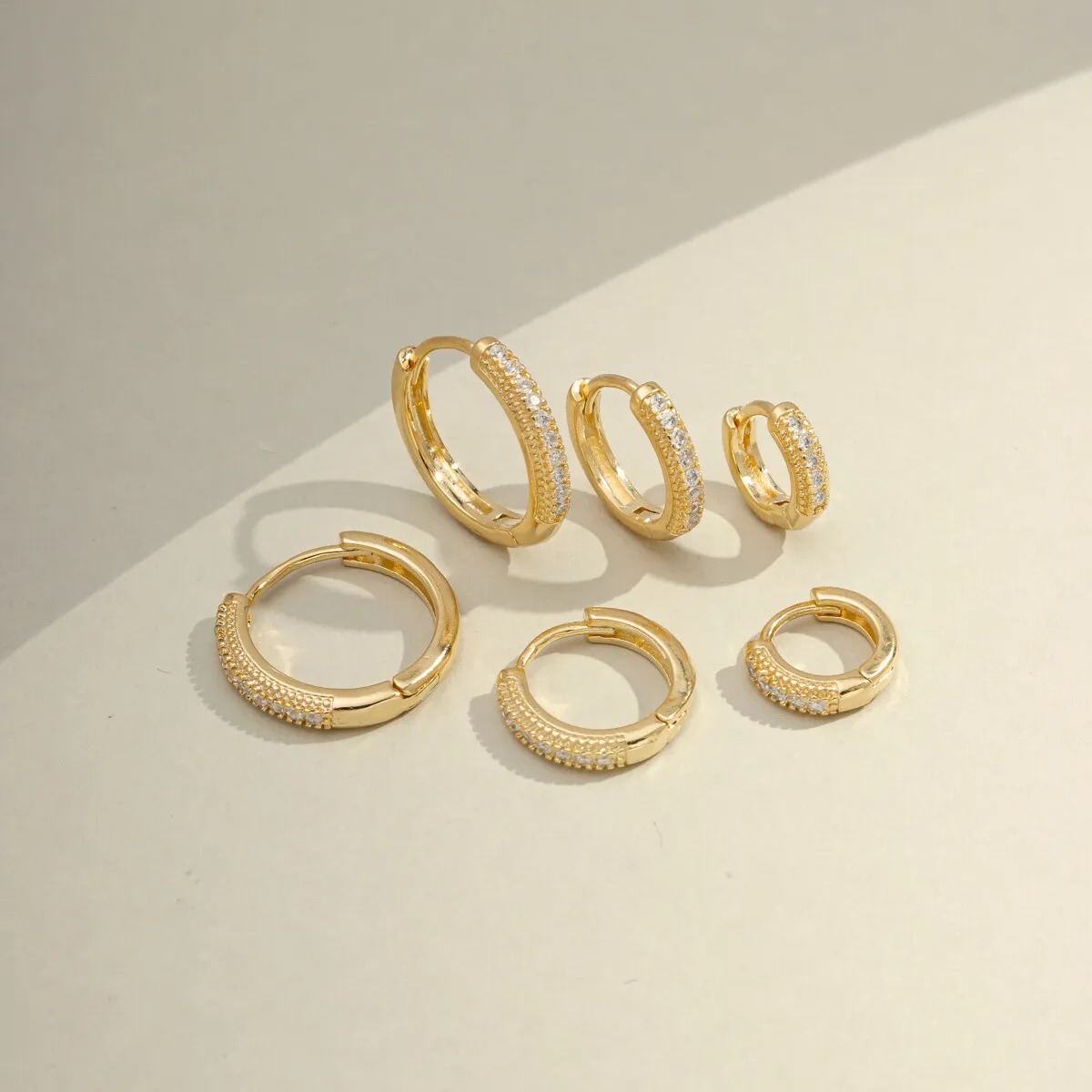Eleve o seu estilo com o Kit de argolas composto por 03 pares cravejados com zircônia e banhados a Ouro 18k.